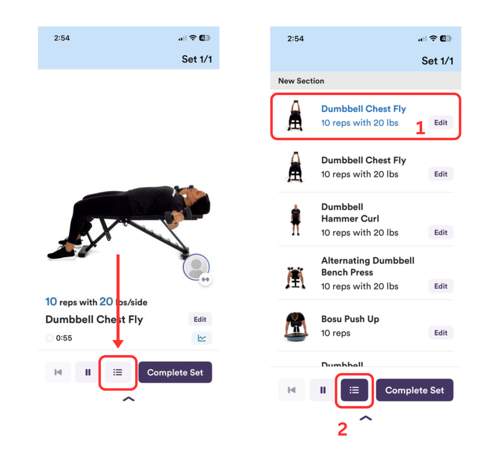 To navigate to a specific exercise (and have it return to the main exercise screen), tap on the exercise you'd like to start (1).