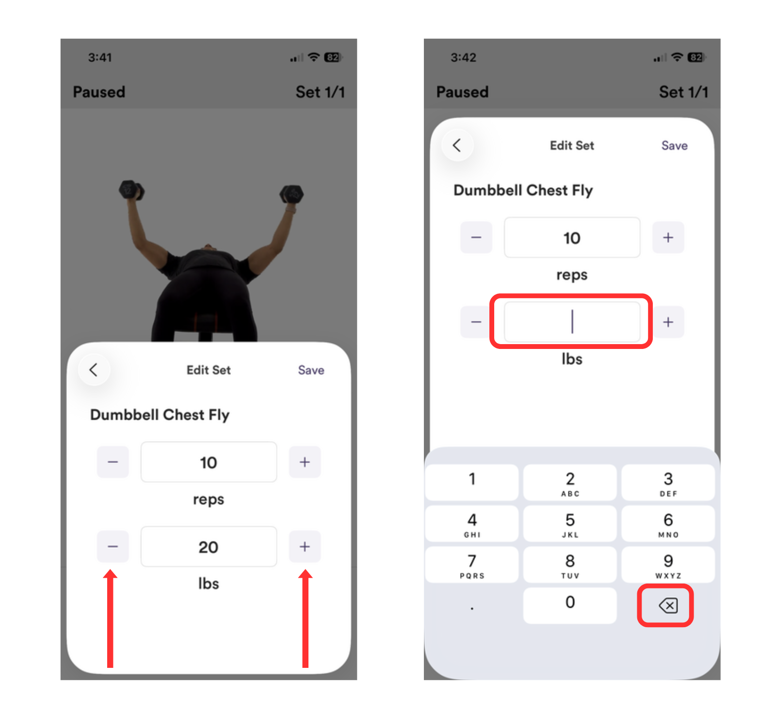 Weight and reps can be modified at any time during a workout in progress. Please note any changes to weights or reps will only be modified for the current workout.