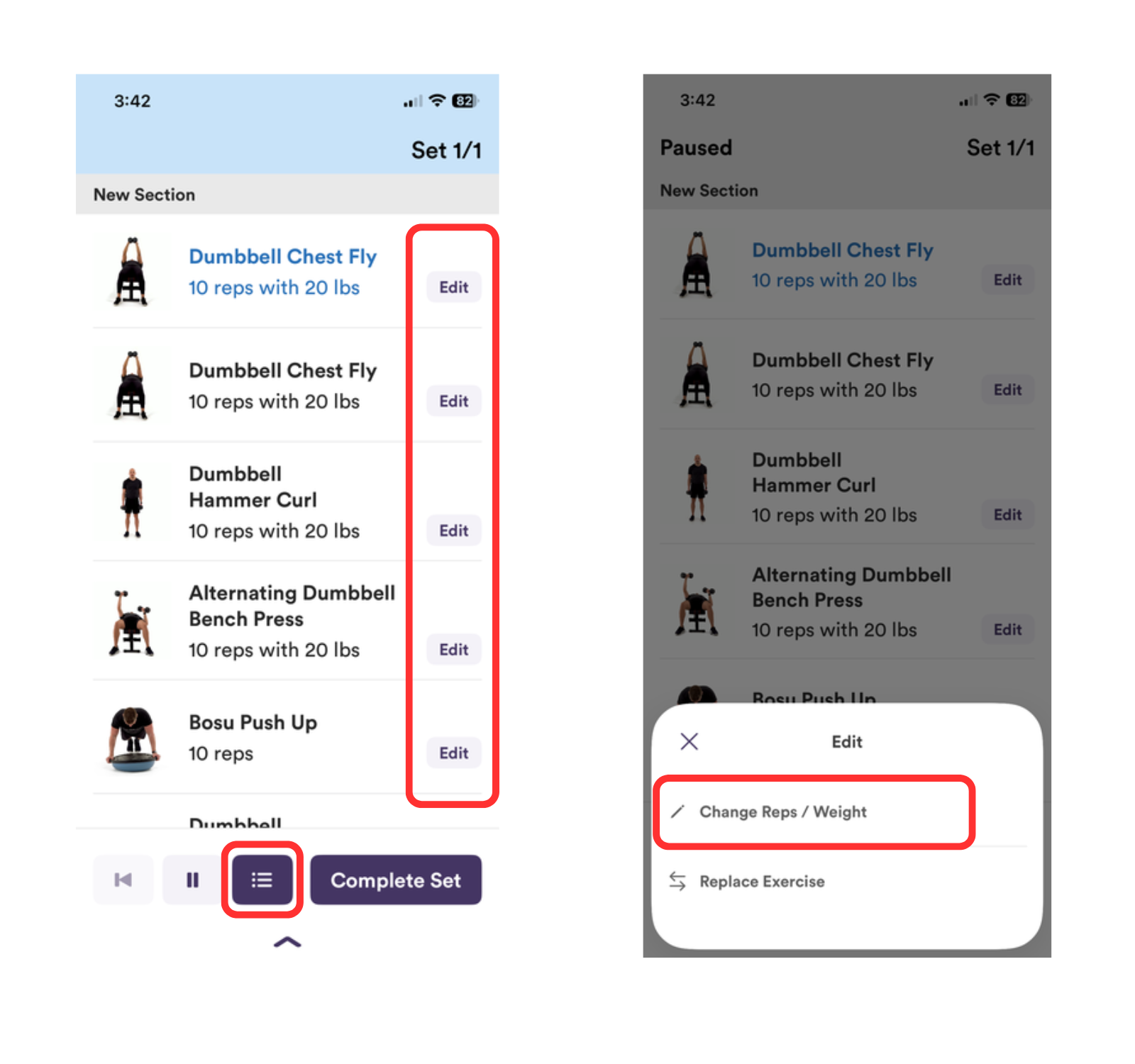 Continue to tap Edit and make the necessary changes, then tap on the Menu icon again to close the list view and continue with the workout