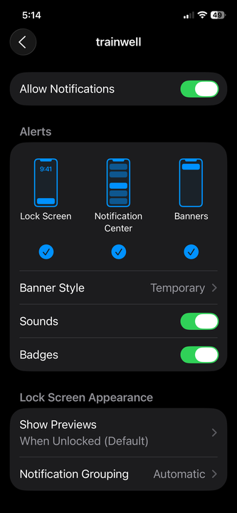 Clicking into Trainwell will present you with all notification options. You can either Allow or Not Allow the notifications at the top of your screen.