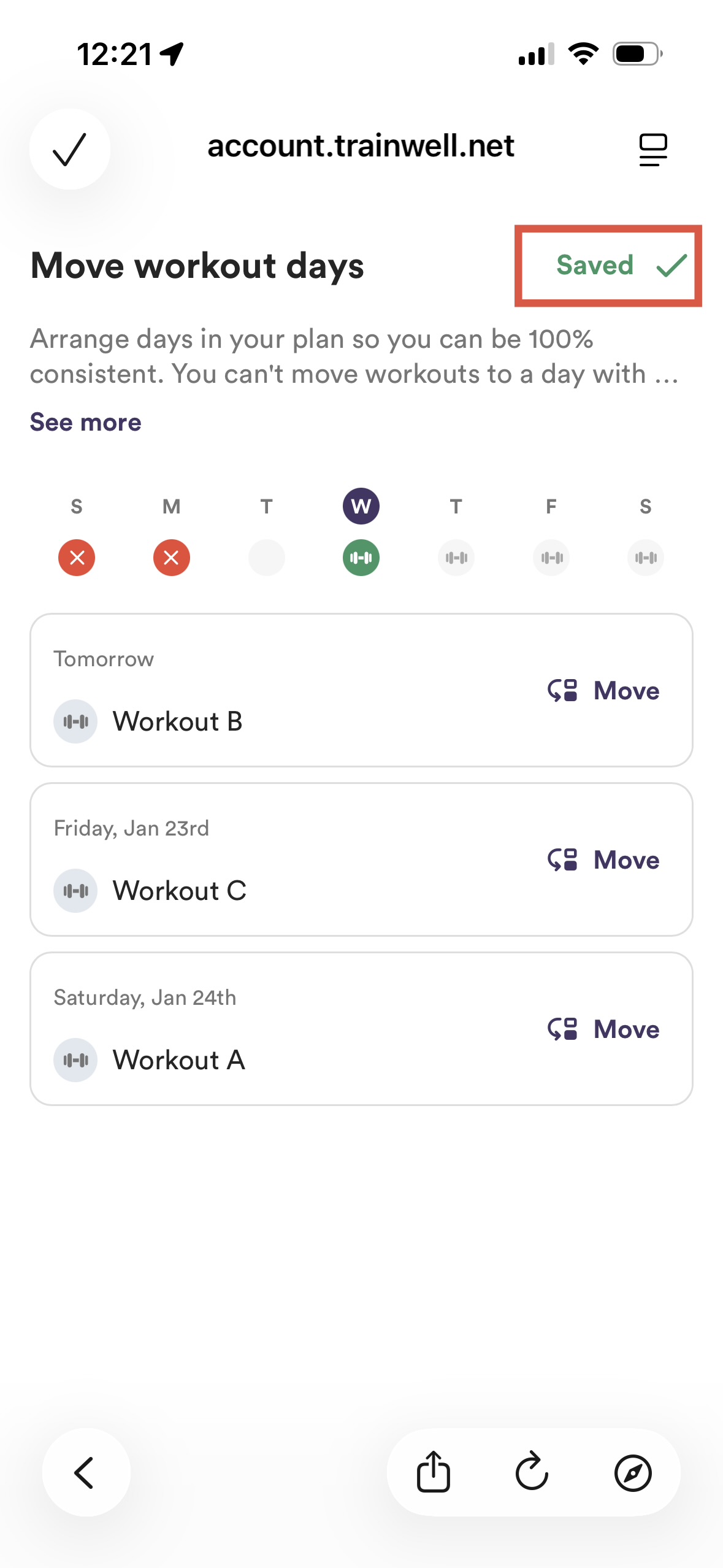 Find the workout you want to move, tap Move, and select a new available day in the current week.