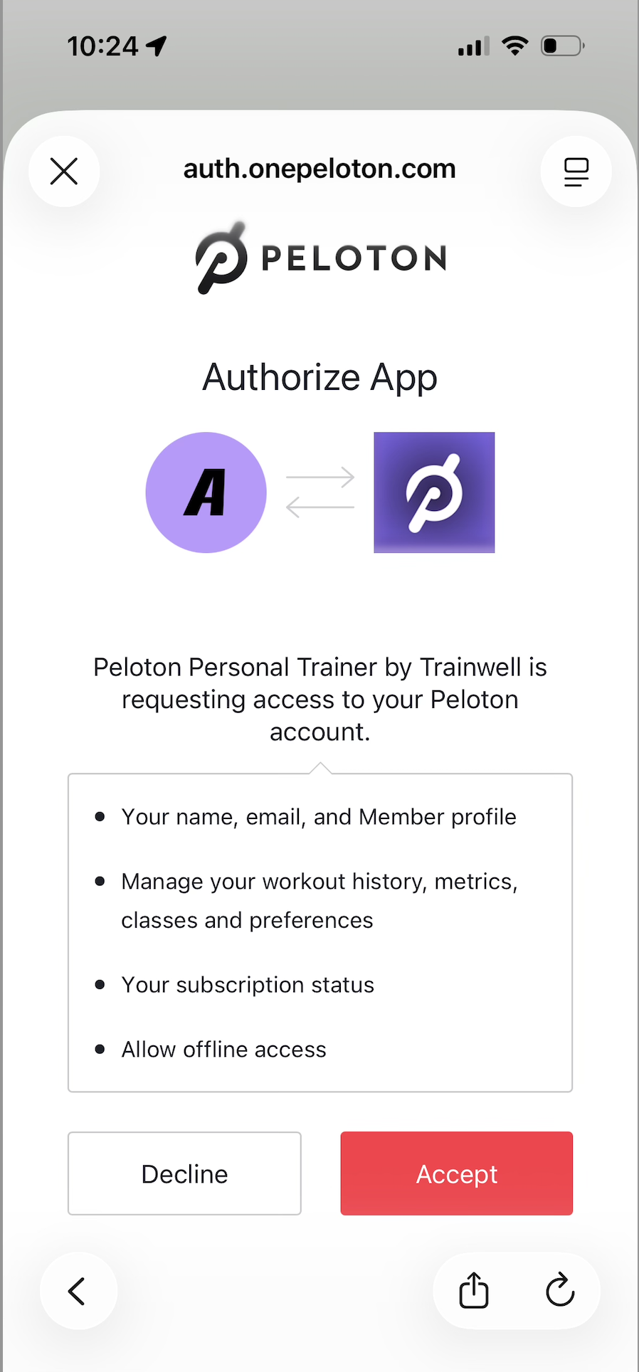 After logging into the Peloton app, you will need to allow Peloton Personal Trainer to access your Peloton account.